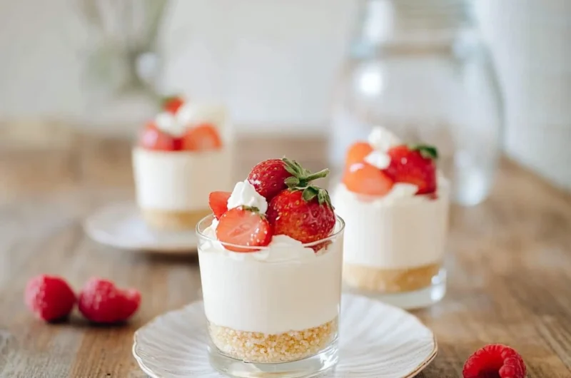 Delicious mini cheesecake desserts served in shot glasses, perfect for parties and gatherings.